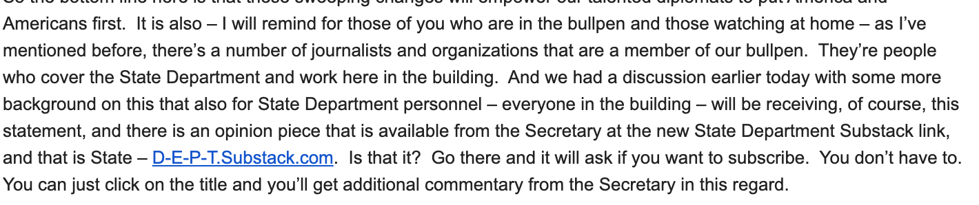 The department already operates a full communications infrastructure through state.gov, with press channels, public briefings, and direct distribution. It doesn’t need more reach. It already has it.