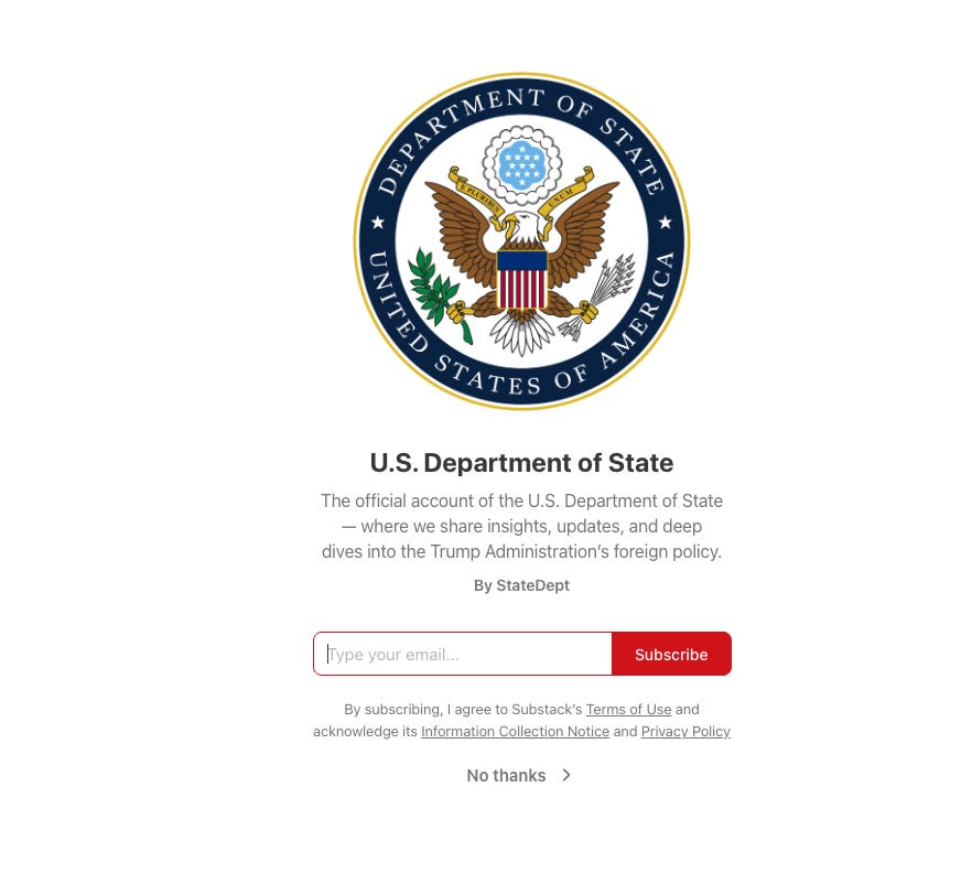 On April 22, the U.S. Department of State announced the launch of a Substack during their formal press briefing. Not as an individual. Not as a side project. As an official communications platform for policy updates and opinion content, blended together under the State Department's seal.